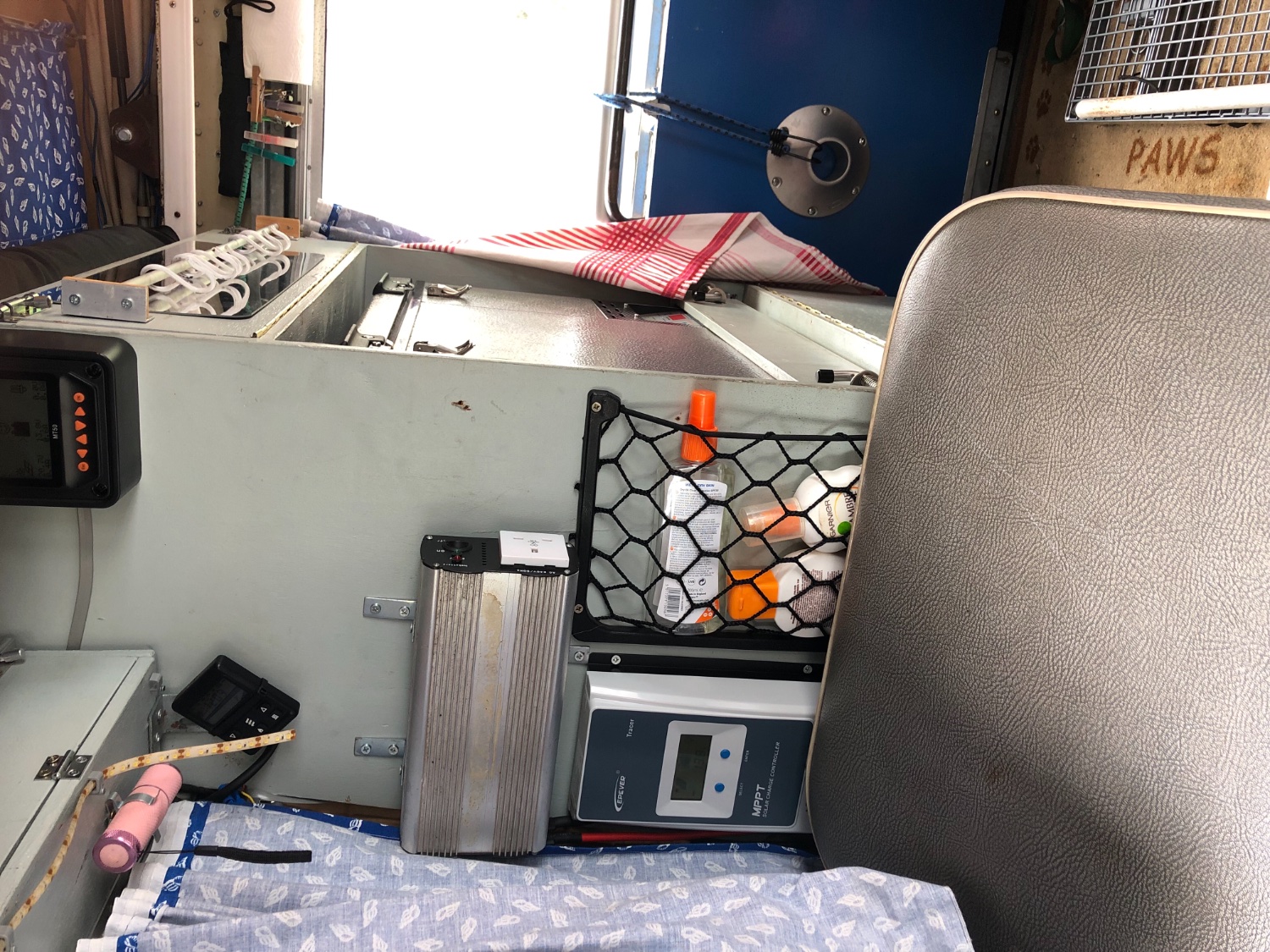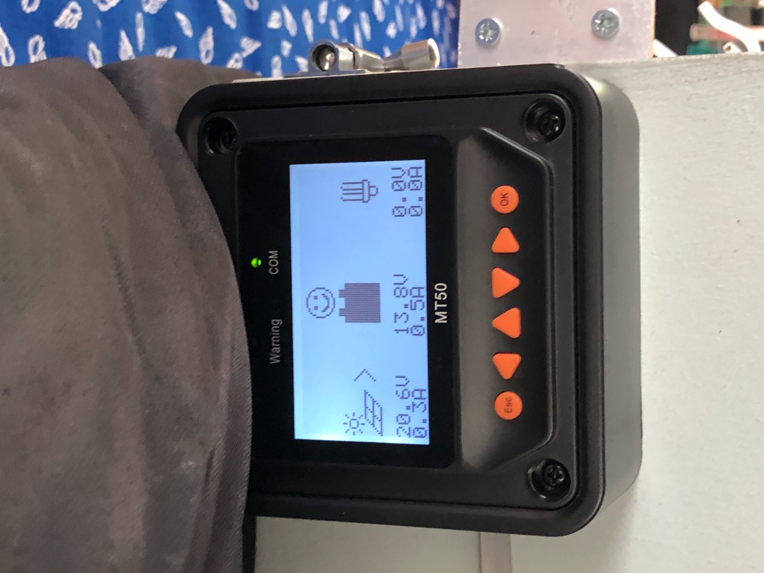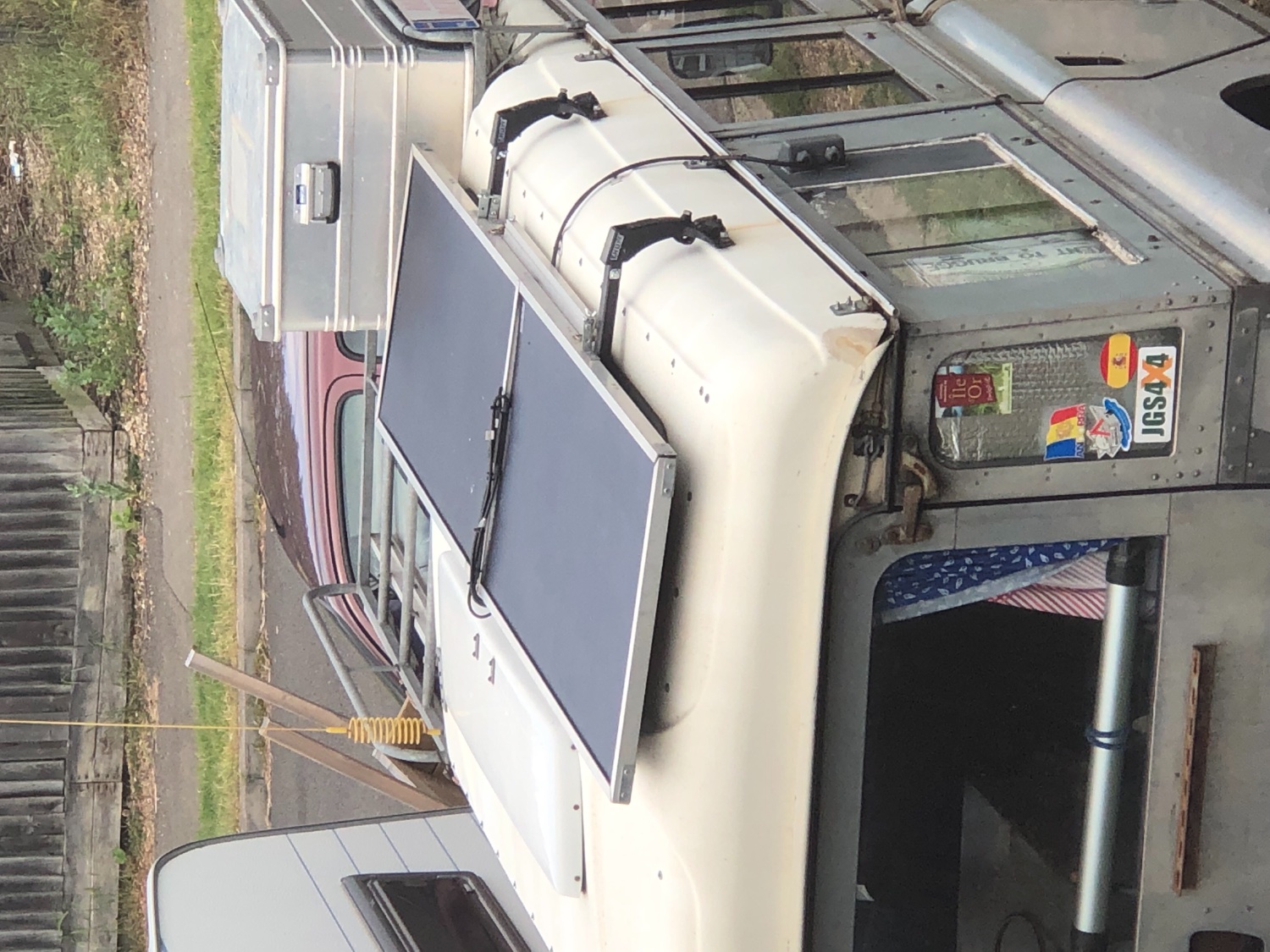 The solar panels I got from ebay from photonic universe. I have 2 of these each 110 watts, flexible (to save weight) with new etfe coating technology. Not cheapest, but this is where you should not skimp on. The frame is also tiltable at the top when the roof is open so it still sits horizontally to maximise the performance. I used existing bolts on the roof to attach it all.