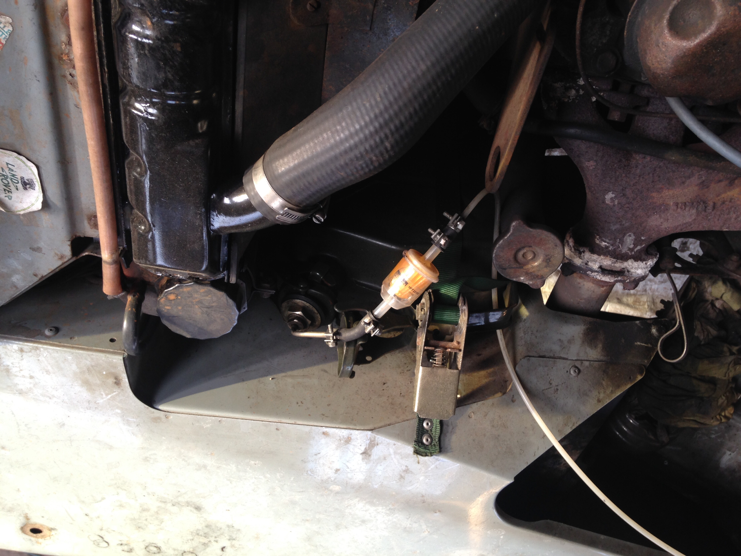Now this copper brake pipe runs to the front of my 109 under the n/s wheel arch very much like a normal car but instead of feeding the brakes it feeds my diesel heater that found it's way off a scrap truck. Now I won't go into details but I now have central heating that's ran off the two 12 volt batteries that are used for when camping.