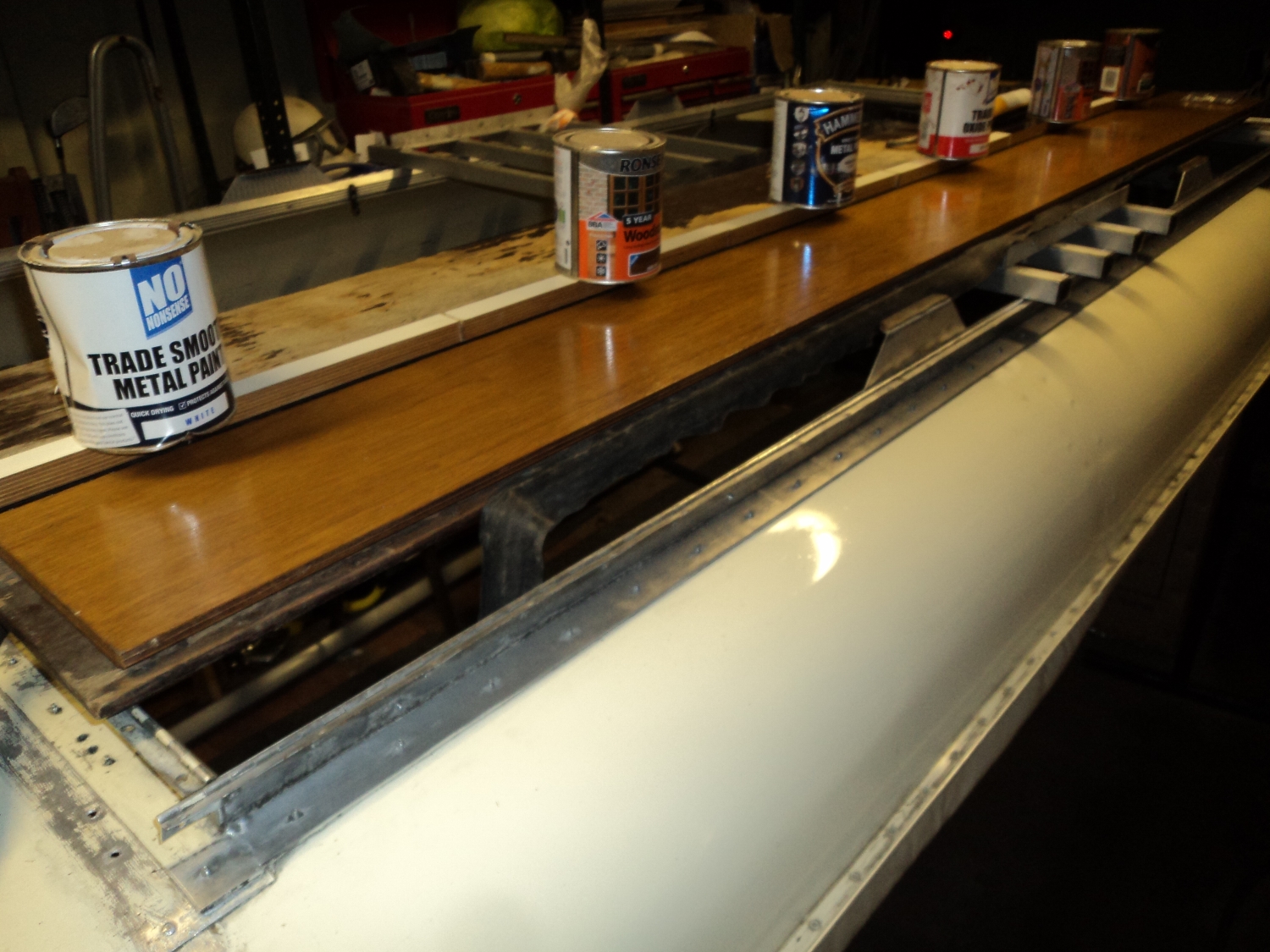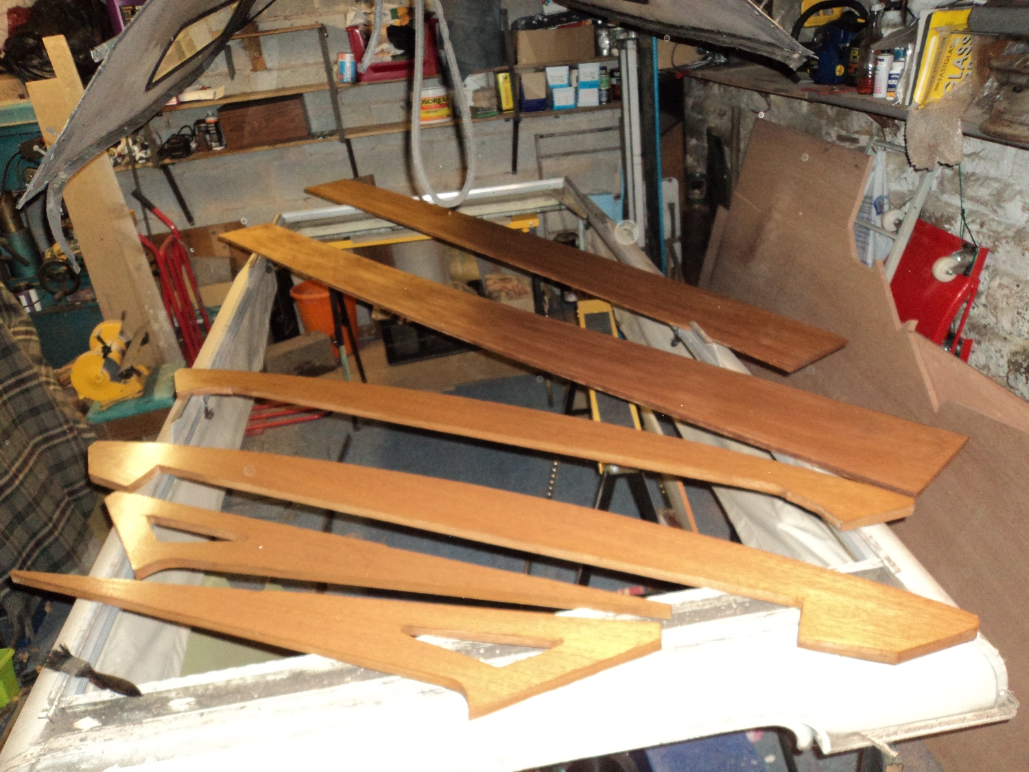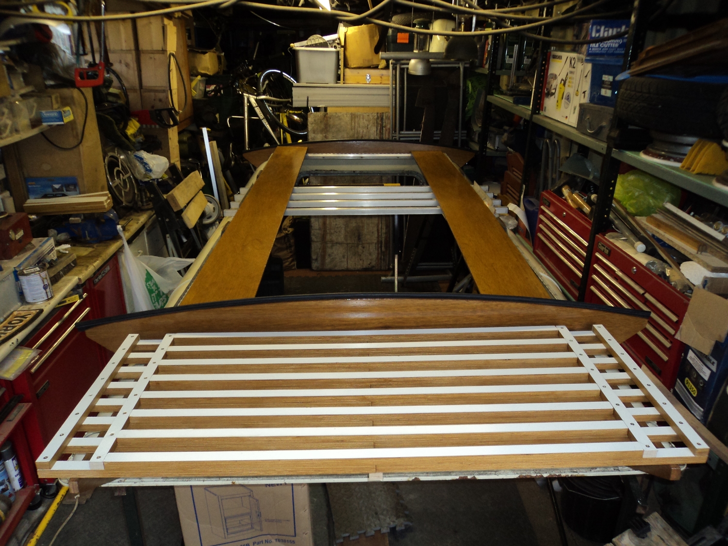 I'd already stained the wood on an earlier evening in the house. I have got an aluminium rack that came with the carawagon....but it's only 1.2m by 0.4m, just 4 bars.....and looked home-made rather than factory anyway. I've preferred the wooden ones I've seen so spent the afternoon cutting and screwing. I think it's come out OK. I just need to stain the ends where I've made cuts before I yacht varnish the whole lot. It's got 8 bars and now measures 1.25m by 0.52m......every little helps they say. I've done it early in the project beause I would have rushed and made a mess of it if it was the last thing to do.