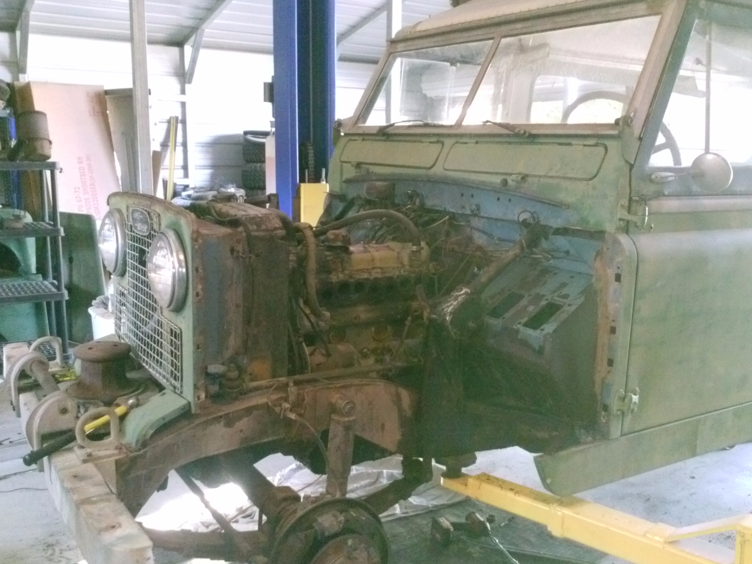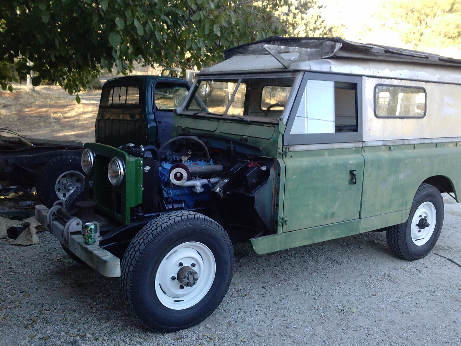 This is Richard from California. I have got my hands on what I found out is a 1967 109" Carawagon. It had been sitting for some time but the California climate is kind to old cars. It has a 2.25L diesel and it is not that common in the states so has been a bit of a hunt for some of the parts. The engine had some odd parts on it as you can see in the pics. I found out the exhaust and oil pan were from a marine version of the 2.25L. It is like a big puzzle. Started in on it with all mechanical systems to get it running. So far so good. I could rebuild most of what I found. Done with the Brakes,Clutch,Cooling system, fuel system, working on the electrical and seats now. Removing 50 yrs of experimental wiring from past owners. everything in the back had been removed and as I look around it seams like each truck was unique so I am free to build it back as I wish. My next job will be the pop-up roof. I have the seals on order and will fabricate new wood sections. I do have questions for anyone that have done this before. Any tips would be appreciated but I'm most interested in how to safely remove the old rivets and piano hinge with out damaging the aluminum roof panel. Enjoy the pics! FYI the guy in the photo is the old owner not me!