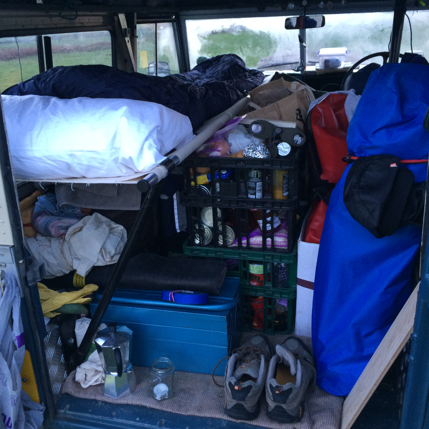 I didn't mind sleeping on a make shift bed to start with but i thought it would be a lot better if my dog didn't have all the bed so i made a three quarter fold up bed out of what i had kicking around along with a cupboard hung from where the roof bolts to the sides also beside that was a two ringed hob type thing that had a grill as well with a cupboard underneath that was the home for cooking utensils.