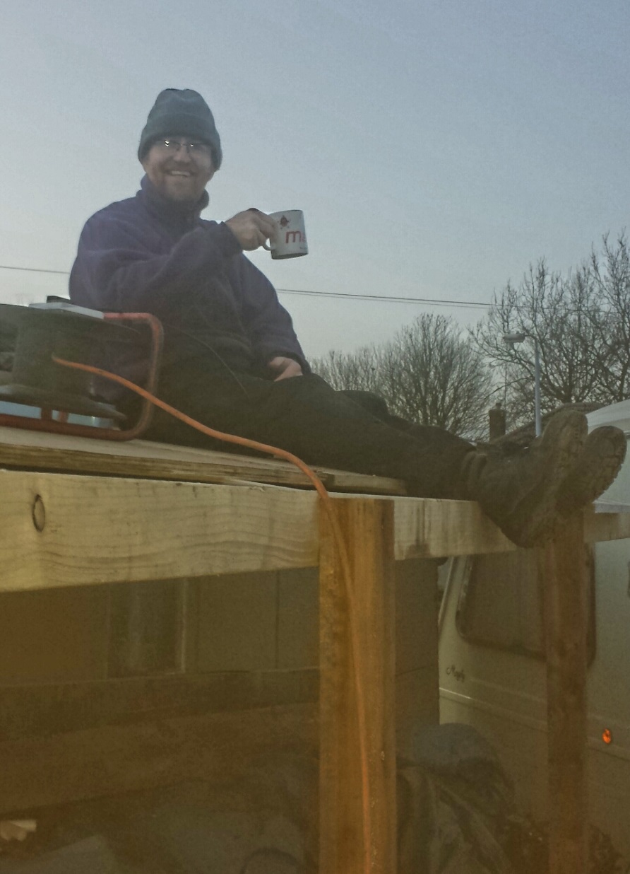 A deal was done that included wood and what was needed for my lean to which the navy Boys family bought with them and after a brew the work began and was completed by night fall which just needs felting when funds allow along with the help of Robin who also nipped over Martin :shrug: well to be honest it is his second home but he is light and was on top of the job literally scrambling about on the top of the roof and last but not least my helper John who knows where most things are in my little sheds better than me i owe you all big time and can't thank you enough :wine: .